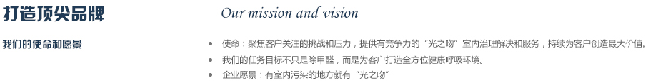 2012年公司斥巨資從德國專業(yè)空氣研發(fā)實驗室引進銳鈦型納米二氧化鈦研發(fā)成果,同時與國內知名高校進行合作,成立“光之吻”品牌,致力于為人類創(chuàng)作純凈,健康的呼吸環(huán)境,成為你身邊的健康衛(wèi)士,實現(xiàn)365天健康呼吸的夢想,目前是同類產品中最有競爭力的品牌之一。